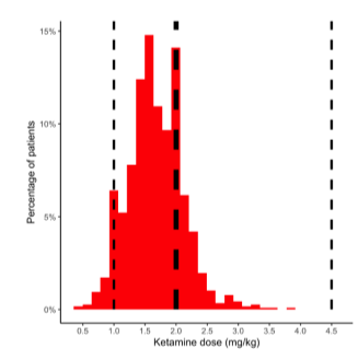 More than half the patients received more that 1.5 mg/kg of ketamine (the usual dose). A significant fraction received much more as shown here:
