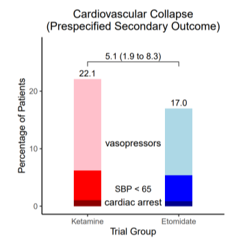 The composite of “Cardiovascular collapse” during intubation occurred in 22.1% in the ketamine group and in 17.0% in the etomidate group. That 5.1% difference was statistically significant!